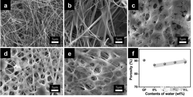 (a)原始GF,(b)GF/PVdF-HFP(0wt%去離子水),(c)GF/SPGE(5wt%去離子水),(d)GF/SPGE(7wt%去離子水),(e)GF/SPGE(9wt%去離子水),(f)具有不同去離子水含量的GF和GF/SPGE的孔隙率。