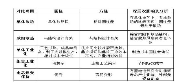 表1圓柱型方型電池性能對比
