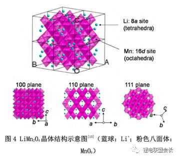 早在1983年M.Thackeray和J.Goodenough等人發現了錳尖晶石(LiMn2O4)可作為鋰離子電池正極材料,理論容量為148mAh/g。尖晶石LiMn2O4結構中氧以立方密堆方式排列組成其晶胞骨架,其中Li+占據1/8的氧四面體8a位置,Mn原子占據1/2氧八面體16d位置。結構中錳有兩種價態,分別為Mn3+和Mn4+,各占50%,材料結構如圖4所示。