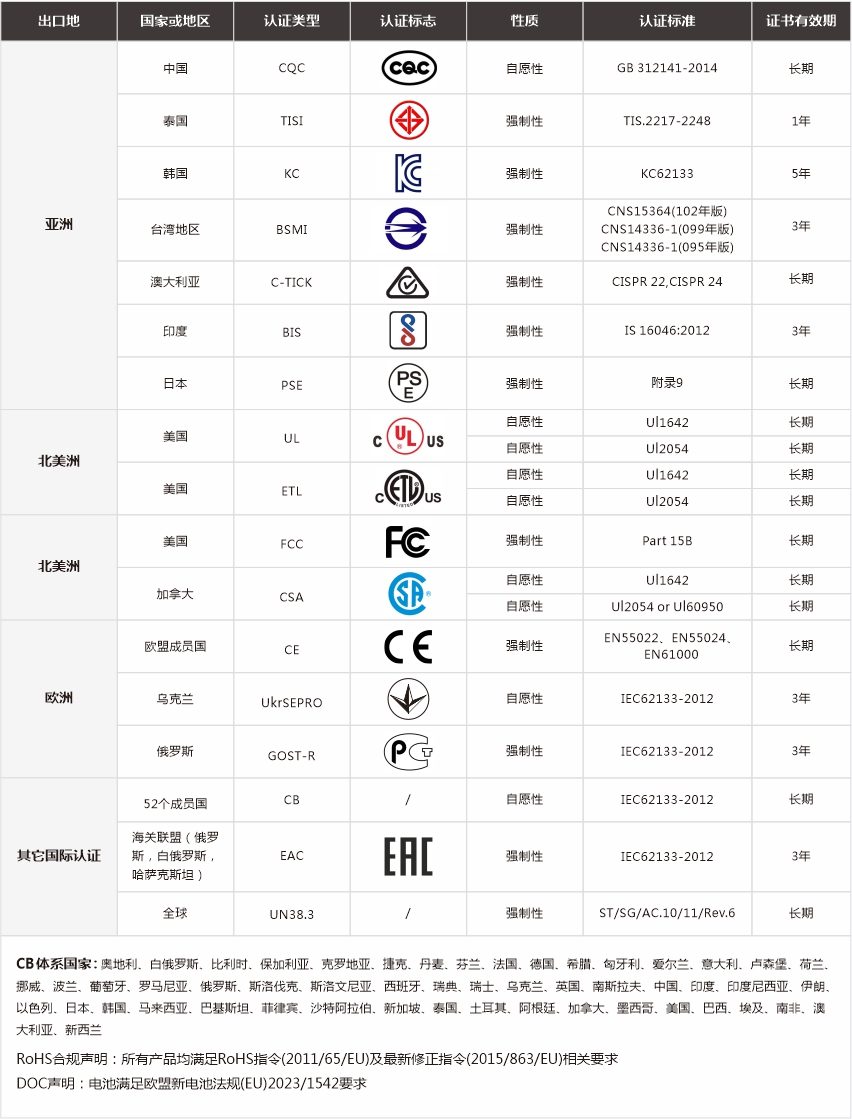 全球主要國家和地區(qū)認證明細(電池產品類)